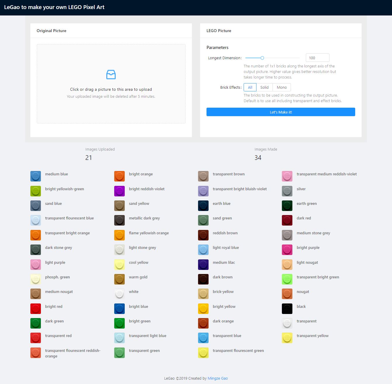 Users can upload an image(<5MB) and decide on which palette to use and how many 1x1 bricks the output image should have for its longest axis. This is useful when we need to make a LEGO mosaic in real world, as a 1x1 brick’s dimension is about 8mm x 8mm.