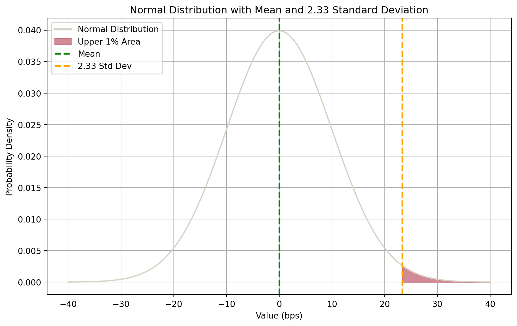 From the plot, we can say that 99% of the time, the asset’s return will be in the blue region, which means that it will not fall below the 99% VaR (recall that VaR is a cutoff value).