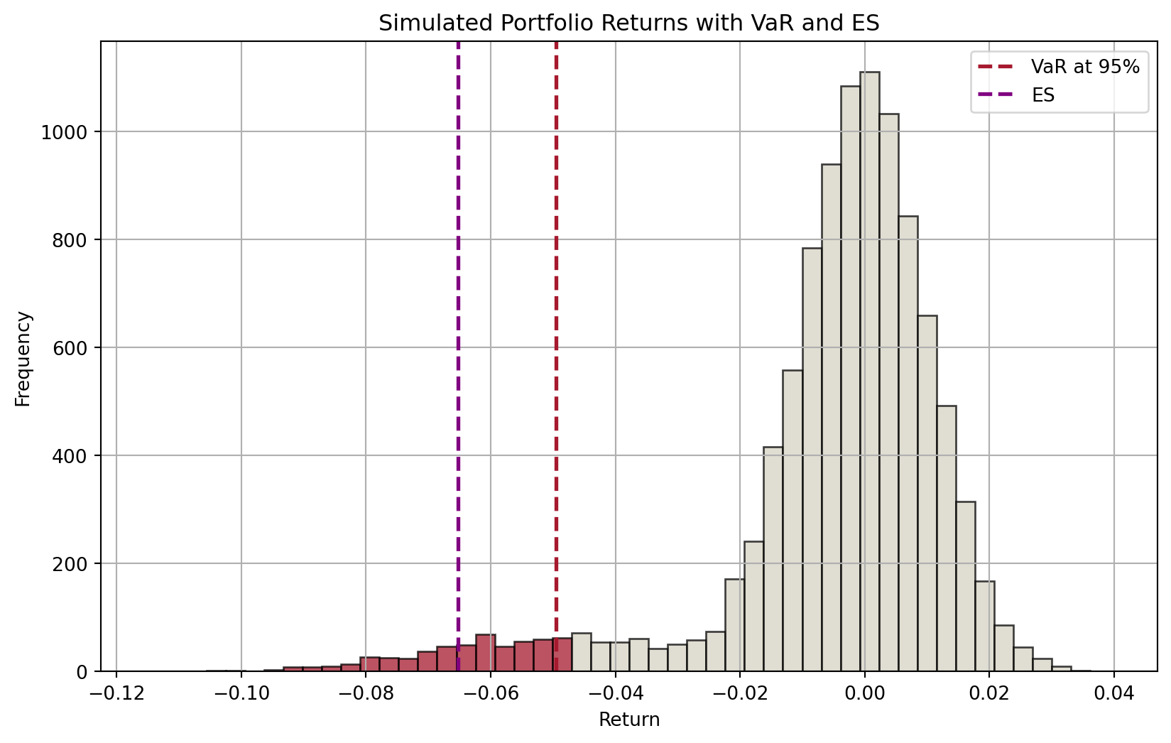 import numpy as npimport matplotlib.pyplot as plt# Parametersnp.random.seed(42)n_scenarios =10000confidence_level =0.95# Adjust Distribution: Mixture of normal distributionsmu2, sigma2 =0, 0.01extreme_mu, extreme_sigma =-0.05, 0.02# Create a mixture distribution that has the desired VaRextreme_component = np.random.normal(extreme_mu, extreme_sigma, int(n_scenarios *0.1))normal_component = np.random.normal(mu2, sigma2, int(n_scenarios *0.9))returns = np.concatenate([extreme_component, normal_component])VaR = np.percentile(returns, (1- confidence_level) *100)# Calculate ESES = np.mean(returns[returns <= VaR])# Plot histogramplt.figure(figsize=(10, 6))# Histogram datan, bins, patches = plt.hist(returns, bins=50, alpha=0.75, edgecolor="black")# Highlight bars below VaRfor i inrange(len(patches)):if bins[i] < VaR: patches[i].set_facecolor("#A6192E")else: patches[i].set_facecolor("#D6D2C4")# Add VaR and ES linesplt.axvline(VaR, color="#A6192E", linestyle="dashed", linewidth=2, label="VaR at 95%")plt.axvline(ES, color="purple", linestyle="dashed", linewidth=2, label="ES")plt.title("Simulated Portfolio Returns with VaR and ES")plt.xlabel("Return")plt.ylabel("Frequency")plt.legend()plt.grid(True)plt.show()
