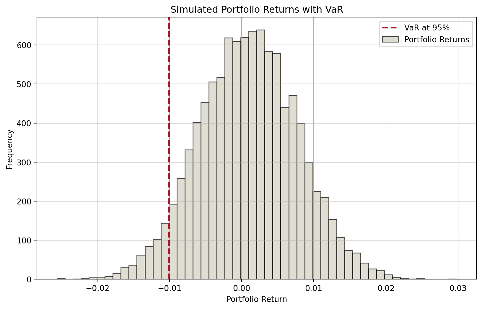 import numpy as npimport matplotlib.pyplot as plt# Parametersnp.random.seed(42)n_assets =3n_scenarios =10000confidence_level =0.95# Mean returns and covariance matrix for the assetsmean_returns = np.array([0.001, 0.0012, 0.0008]) # Example mean returnscov_matrix = np.array( [ [0.0001, 0.00002, 0.000015], [0.00002, 0.0001, 0.000025], [0.000015, 0.000025, 0.0001], ]) # Example covariance matrix# Cholesky decomposition of the covariance matrixL = np.linalg.cholesky(cov_matrix)# Generate standard normal random variablesZ = np.random.normal(size=(n_scenarios, n_assets))# Simulate asset returnssimulated_returns = Z @ L.T + mean_returns# Given weightsweights = np.array([0.4, 0.3, 0.3]) # Example weights# Calculate portfolio returnsportfolio_returns = simulated_returns @ weights# Calculate VaRVaR = np.percentile(portfolio_returns, (1- confidence_level) *100)# Plotting the portfolio returns and VaRplt.figure(figsize=(10, 6))plt.hist(portfolio_returns, bins=50, alpha=0.75, color="#D6D2C4", edgecolor="black")plt.axvline(VaR, color="#A6192E", linestyle="dashed", linewidth=2)plt.title("Simulated Portfolio Returns with VaR")plt.xlabel("Portfolio Return")plt.ylabel("Frequency")plt.legend(["VaR at 95%", "Portfolio Returns"])plt.grid(True)plt.show()