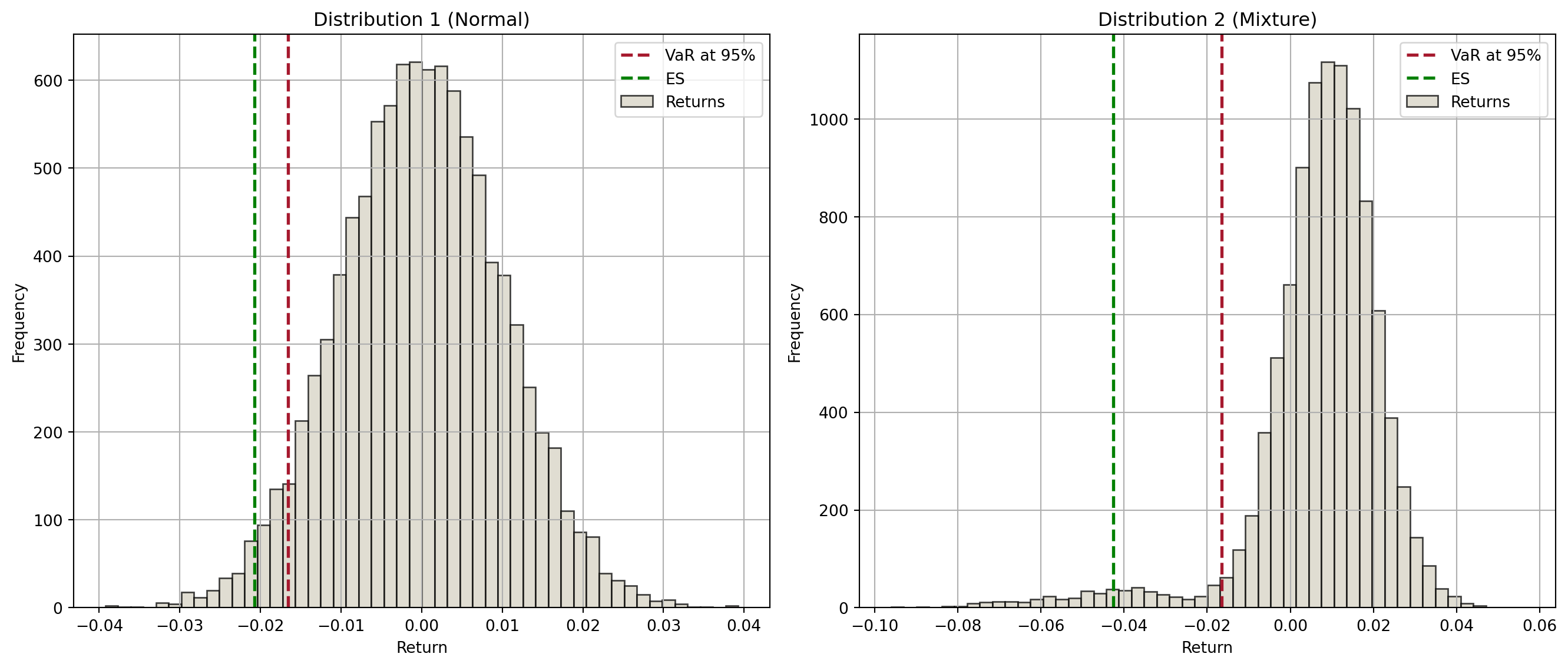 import numpy as npimport matplotlib.pyplot as plt# Parametersnp.random.seed(42)n_scenarios =10000confidence_level =0.95# Distribution 1: Normal distributionmu1, sigma1 =0, 0.01returns1 = np.random.normal(mu1, sigma1, n_scenarios)VaR1 = np.percentile(returns1, (1- confidence_level) *100)# Adjust Distribution 2: Mixture of normal distributionsmu2, sigma2 =0.01, 0.01extreme_mu, extreme_sigma =-0.04, 0.02# Create a mixture distribution that has the same VaR as Distribution 1# Adjust the proportion and parameters of the extreme component to match the target VaRfor _ inrange(1000): extreme_component = np.random.normal( extreme_mu, extreme_sigma, int(n_scenarios *0.05) ) normal_component = np.random.normal(mu2, sigma2, int(n_scenarios *0.95)) returns2 = np.concatenate([extreme_component, normal_component]) VaR2 = np.percentile(returns2, (1- confidence_level) *100)ifabs(VaR2 - VaR1) <0.0001:break# Calculate ESES1 = np.mean(returns1[returns1 <= VaR1])ES2 = np.mean(returns2[returns2 <= VaR2])# Plot histogramsplt.figure(figsize=(14, 6))# Plot for Distribution 1plt.subplot(1, 2, 1)plt.hist(returns1, bins=50, alpha=0.75, color="#D6D2C4", edgecolor="black")plt.axvline(VaR1, color="#A6192E", linestyle="dashed", linewidth=2)plt.axvline(ES1, color="green", linestyle="dashed", linewidth=2)plt.title("Distribution 1 (Normal)")plt.xlabel("Return")plt.ylabel("Frequency")plt.legend(["VaR at 95%", "ES", "Returns"])plt.grid(True)# Plot for Distribution 2plt.subplot(1, 2, 2)plt.hist(returns2, bins=50, alpha=0.75, color="#D6D2C4", edgecolor="black")plt.axvline(VaR2, color="#A6192E", linestyle="dashed", linewidth=2)plt.axvline(ES2, color="green", linestyle="dashed", linewidth=2)plt.title("Distribution 2 (Mixture)")plt.xlabel("Return")plt.ylabel("Frequency")plt.legend(["VaR at 95%", "ES", "Returns"])plt.grid(True)plt.tight_layout()plt.show()print(f"Left: 95% VaR={VaR1:.5f}; Right: 95% VaR={VaR2:.5f}")print(f"Left: Average loss beyond VaR is {ES1:.5f}")print(f"Right: Average loss beyond VaR is {ES2:.5f}")