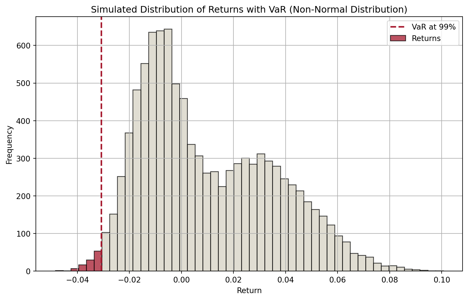 # Simulate returns with a non-normal distribution (e.g., bimodal distribution)np.random.seed(42)# Parameters for bimodal distributionn =10000mu1, sigma1, weight1 =-0.01, 0.01, 0.5mu2, sigma2, weight2 =0.03, 0.02, 0.5# Generate bimodal returnsreturns1 = np.random.normal(mu1, sigma1, int(n * weight1))returns2 = np.random.normal(mu2, sigma2, int(n * weight2))returns = np.concatenate([returns1, returns2])# Calculate VaRconfidence_level =0.99VaR = np.percentile(returns, (1- confidence_level) *100)# Plot histogram with different colors for bars below and above VaRplt.figure(figsize=(10, 6))# Histogram datan, bins, patches = plt.hist(returns, bins=50, alpha=0.75, edgecolor="black")# Change color of barsfor i inrange(len(patches)):if bins[i] < VaR: patches[i].set_facecolor("#A6192E")else: patches[i].set_facecolor("#D6D2C4")# Add VaR lineplt.axvline(VaR, color="#A6192E", linestyle="dashed", linewidth=2)plt.title("Simulated Distribution of Returns with VaR (Non-Normal Distribution)")plt.xlabel("Return")plt.ylabel("Frequency")plt.legend(["VaR at 99%", "Returns"])plt.grid(True)plt.show()