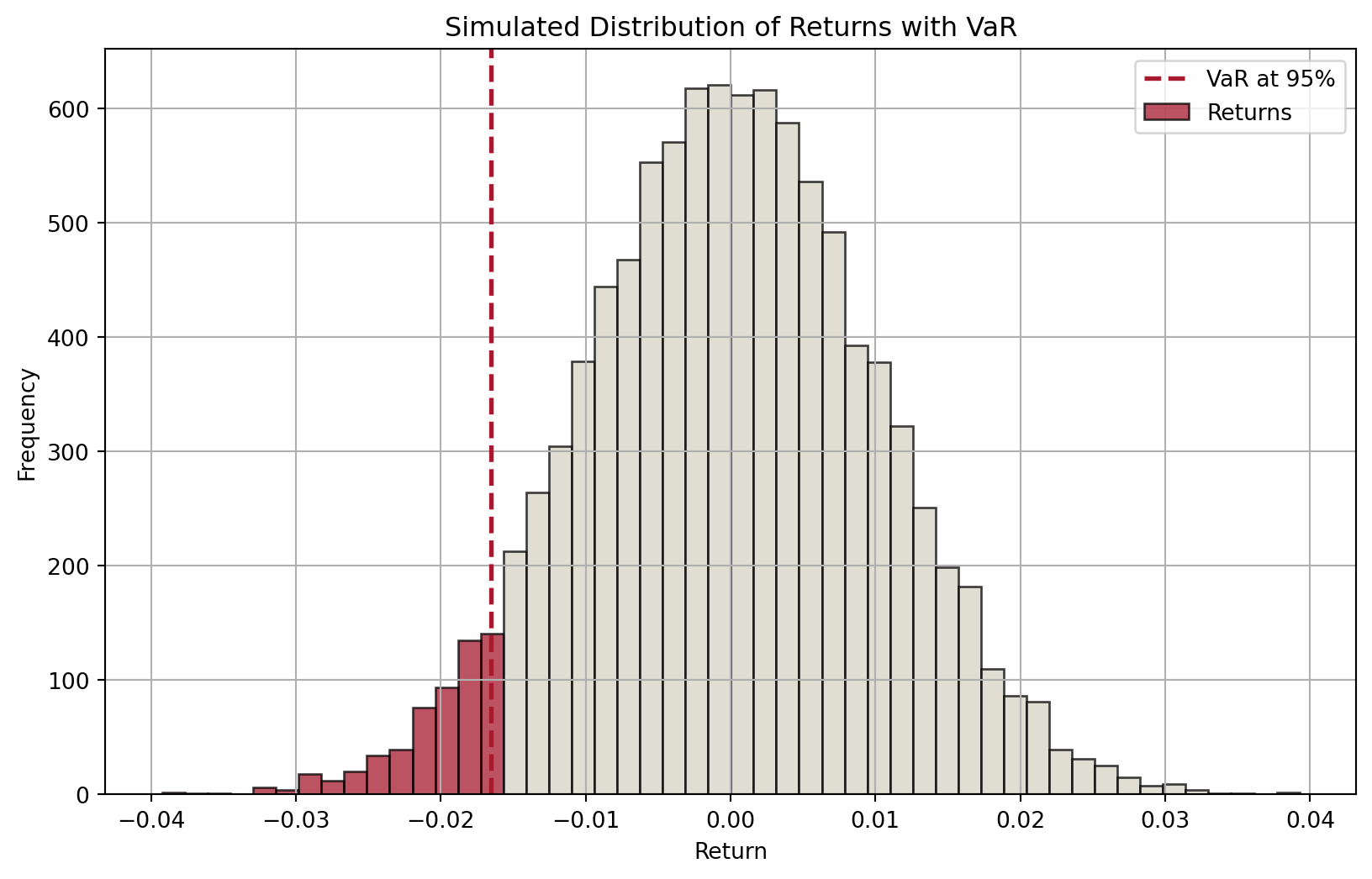 import numpy as npimport matplotlib.pyplot as plt# Set seed for reproducibilitynp.random.seed(42)# Parametersmu =0# Mean of returnssigma =0.01# Standard deviation of returnsn =10000# Number of simulationsconfidence_level =0.95# Simulate returnsreturns = np.random.normal(mu, sigma, n)# Calculate VaRVaR = np.percentile(returns, (1- confidence_level) *100)# Plot histogram with different colors for bars below and above VaRplt.figure(figsize=(10, 6))# Histogram datan, bins, patches = plt.hist(returns, bins=50, alpha=0.75, edgecolor="black")# Change color of barsfor i inrange(len(patches)):if bins[i] < VaR: patches[i].set_facecolor("#A6192E")else: patches[i].set_facecolor("#D6D2C4")# Add VaR lineplt.axvline(VaR, color="#A6192E", linestyle="dashed", linewidth=2)plt.title("Simulated Distribution of Returns with VaR")plt.xlabel("Return")plt.ylabel("Frequency")plt.legend(["VaR at 95%", "Returns"])plt.grid(True)plt.show()