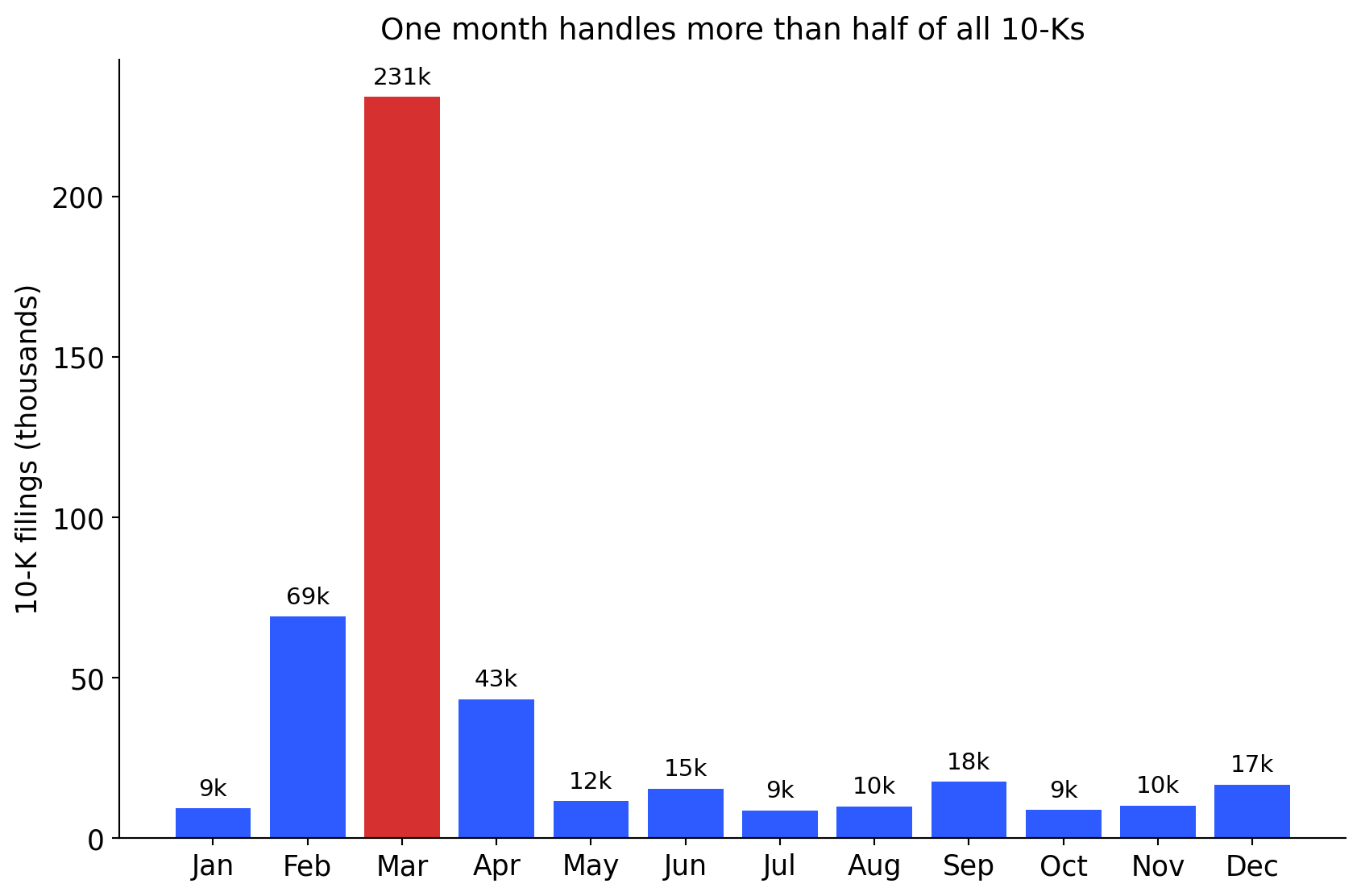 Most U.S. firms have a December fiscal year-end. Large filers must submit their 10-K within 60 days, others within 75–90 days. The calendar shapes the data.