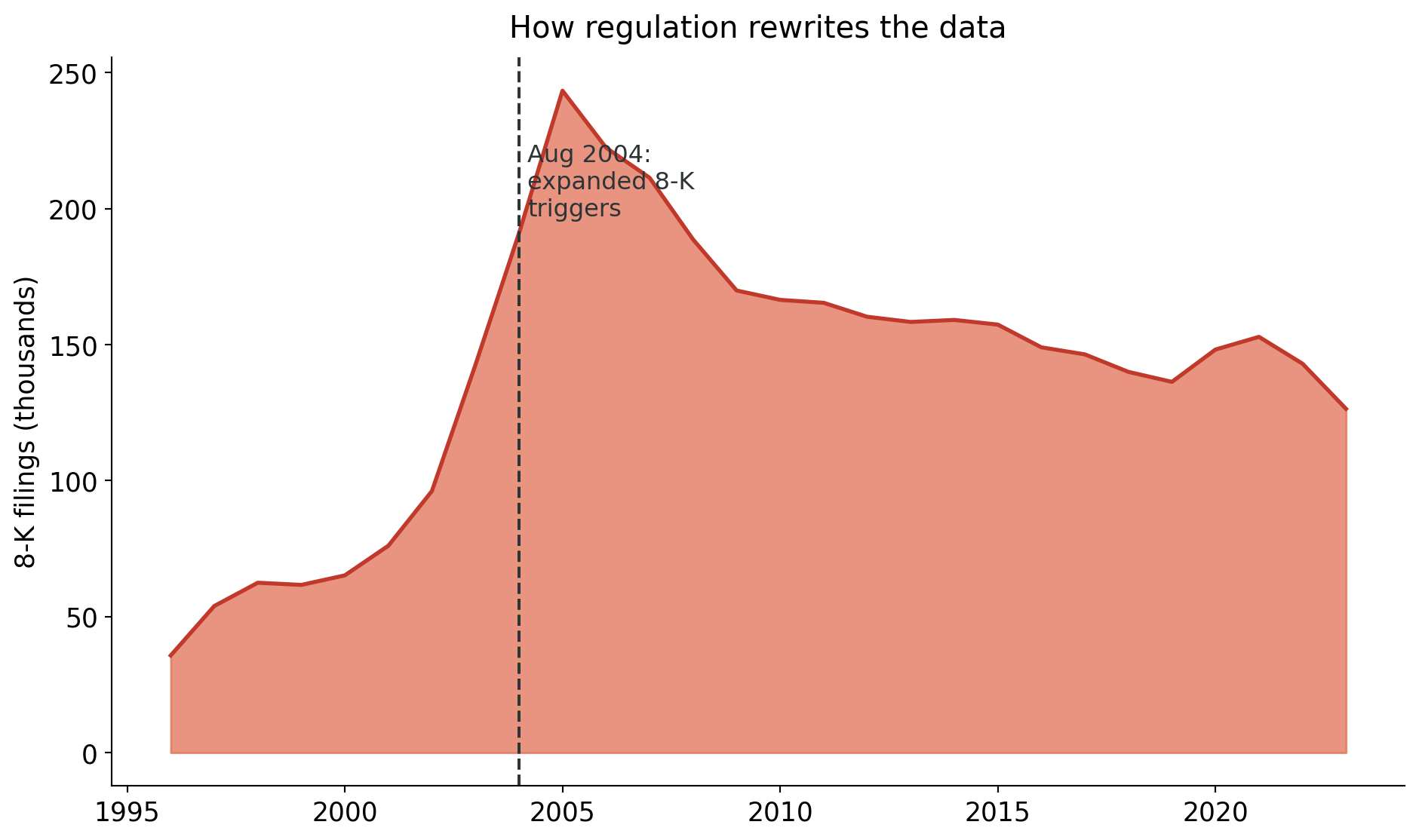 The step-up in 2003–2004 reflects widening 8-K triggers and expanded ownership-reporting rules. Each regulatory change leaves a fingerprint in the data.
