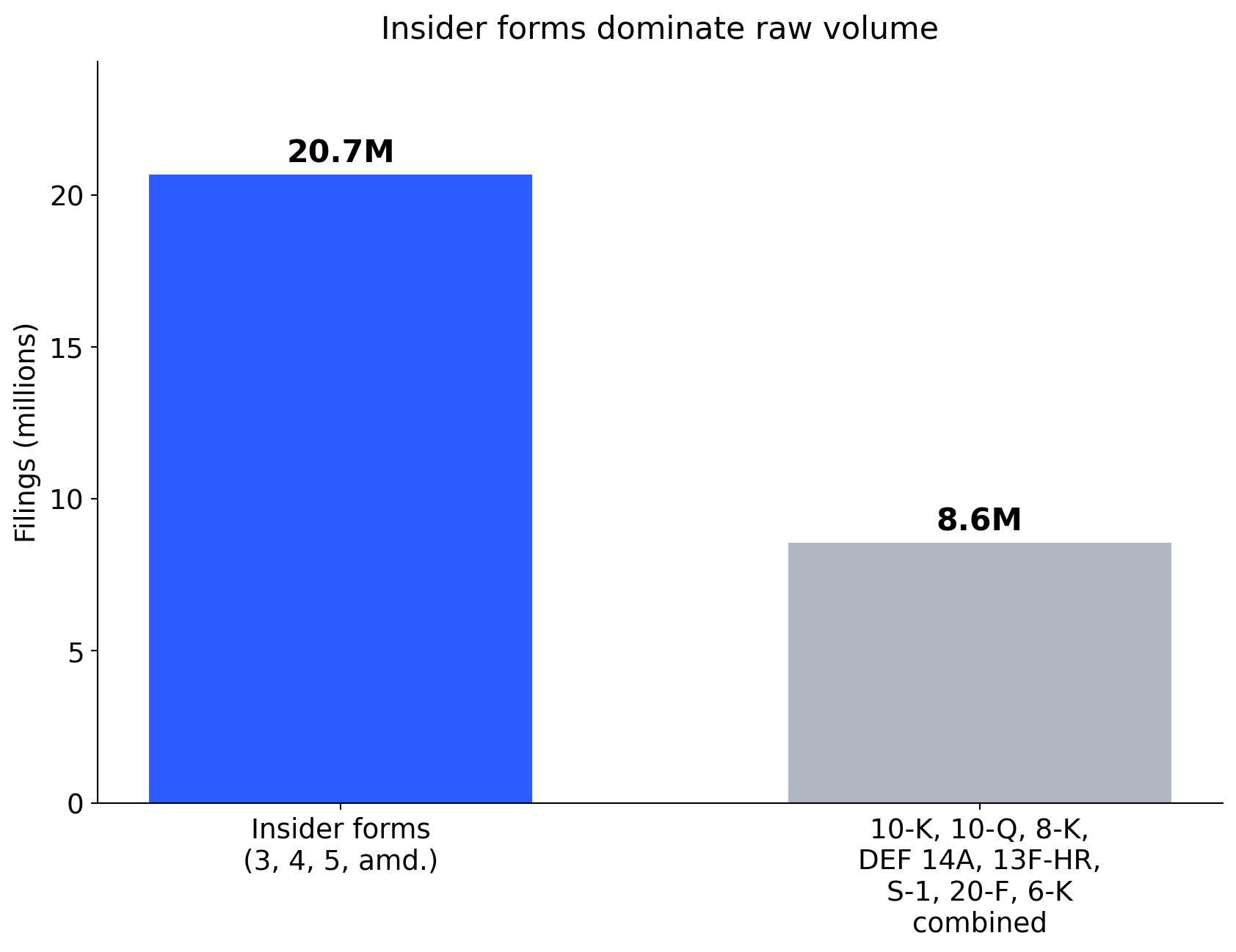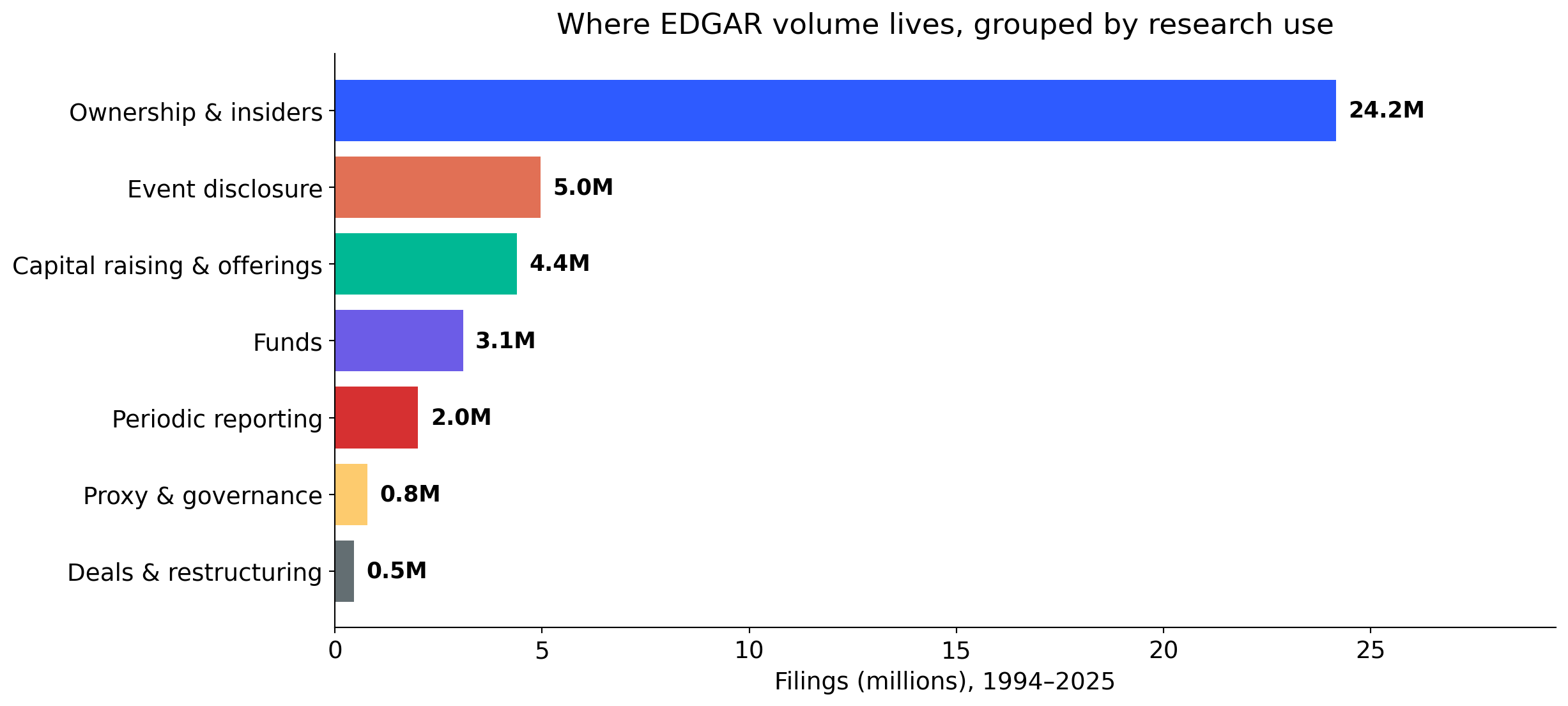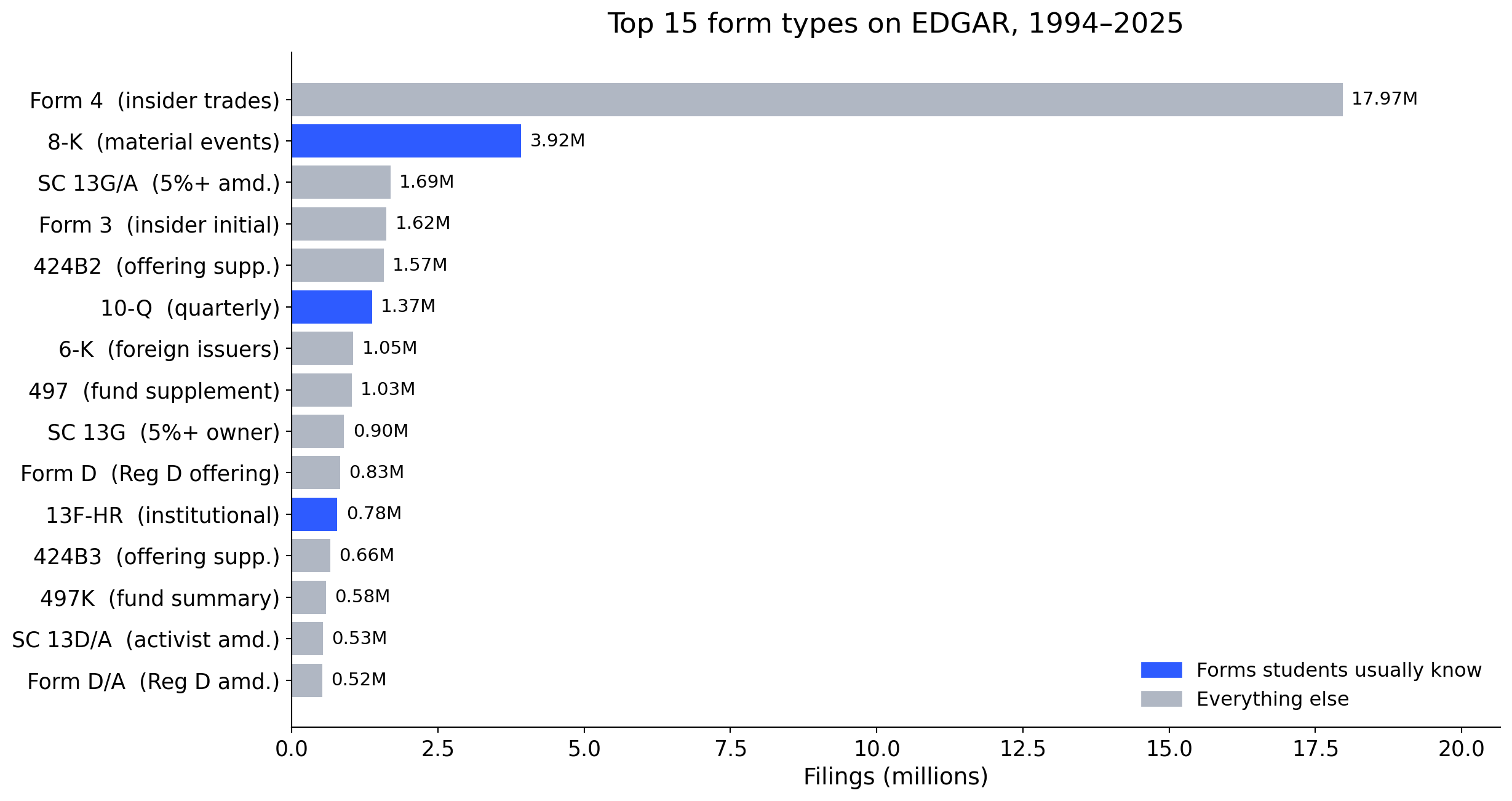 Periodic 10-K / 10-Q filings are a small share of EDGAR volume. The archive is far broader than the forms we teach first.
