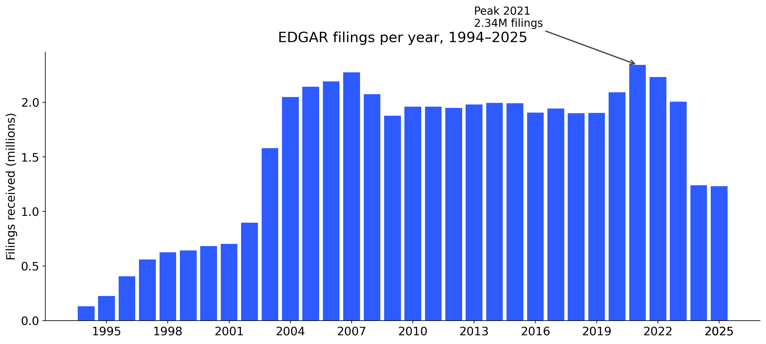 Counts computed from the SEC EDGAR full-index. Search volume from the SEC FY 2025 Congressional Budget Justification.