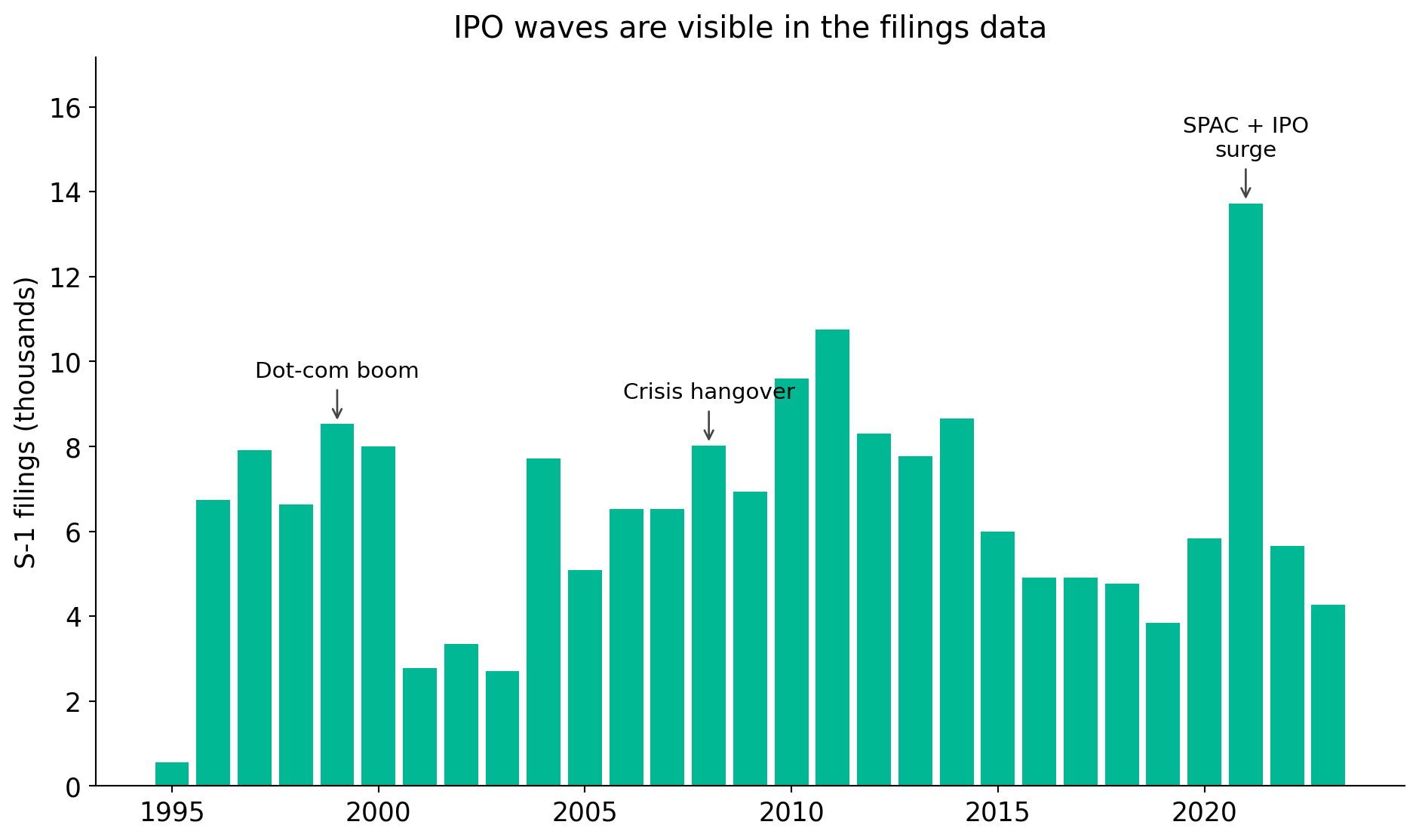 Market history is written in these filings. Dot-com (1999–2000), the post-crisis freeze (2008–2009), and the 2021 SPAC / IPO wave all show up as bumps in the S-1 series.