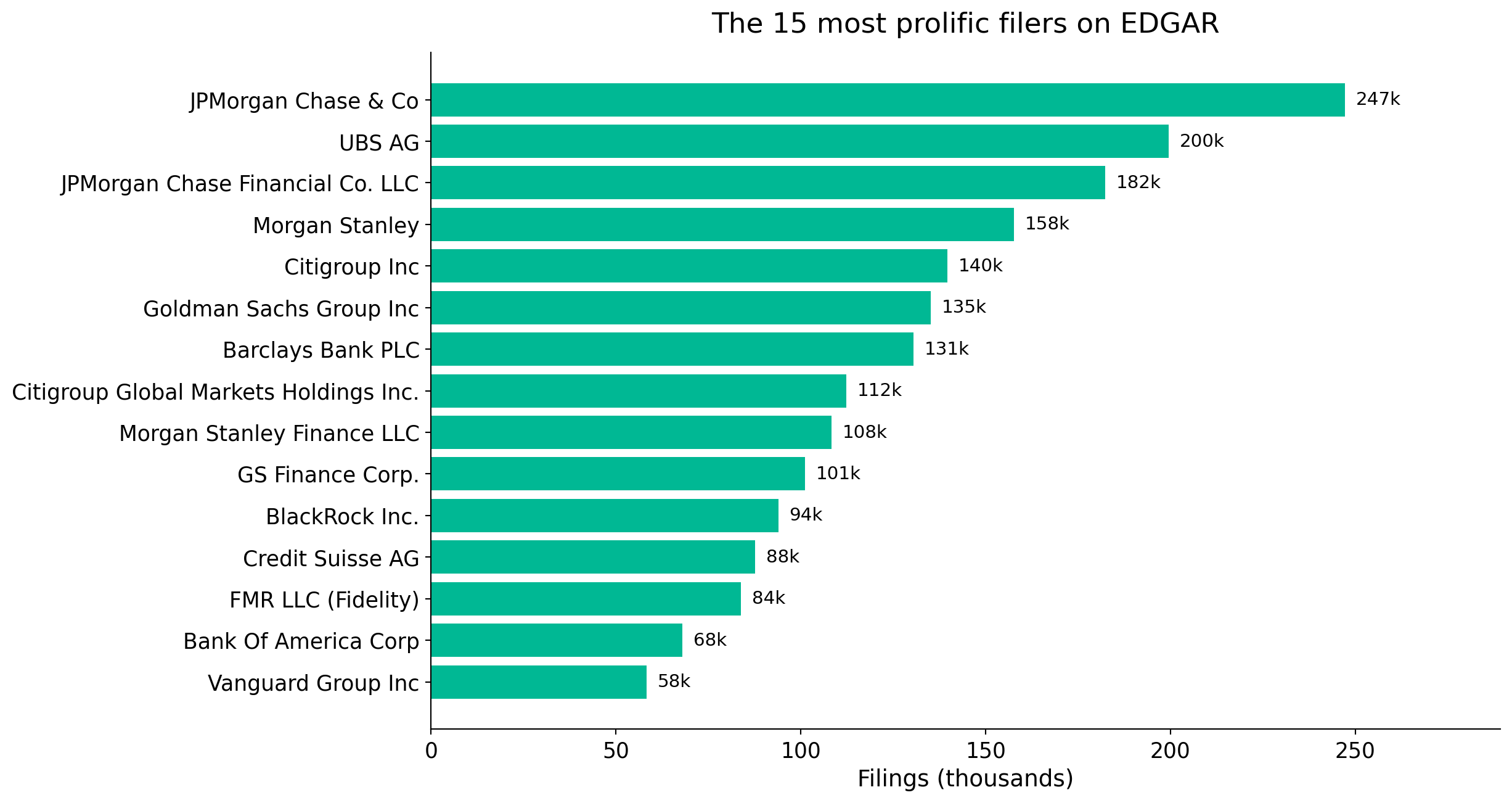 Not Apple. Not Tesla. The most prolific filers are investment banks, asset managers, and their structured-product issuing vehicles submitting thousands of offering supplements and ownership reports. The “firm” in your data is not always the “firm” in your theory.